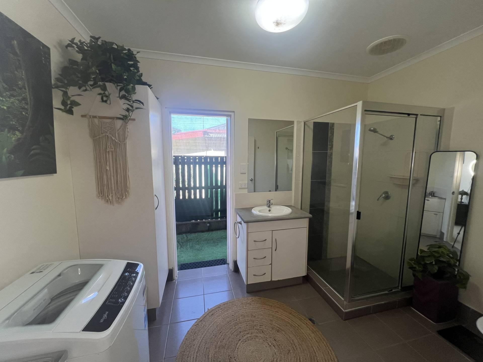 Both bedrooms are complete with built-in robes, vertical blinds, ceiling fans, and split-system air conditioning. The master bedroom boasts direct access to the backyard, enhancing the indoor-outdoor flow. The spacious bathroom is cleverly integrated with a functional laundry space, featuring a linen cupboard, laundry tub, and room for a washing machine.